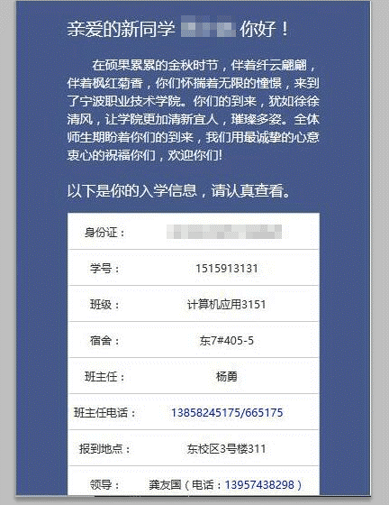 2、如有特殊情况不能按时报到者,须提前向招生办办理请假手续。按规定,逾期两周未报到的新生视为放弃入学资格。招生办咨询电话057486891301、86891302和企业营销QQ:4009910863。班主任联系新生时,如涉及请假等事宜,新生须另行向学校招生办正式办理请假手续,经同意后方为有效。