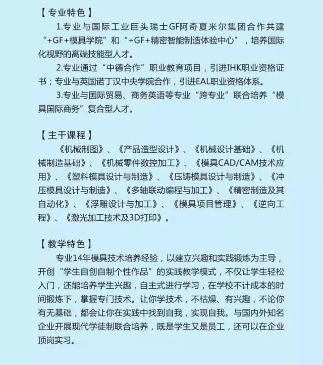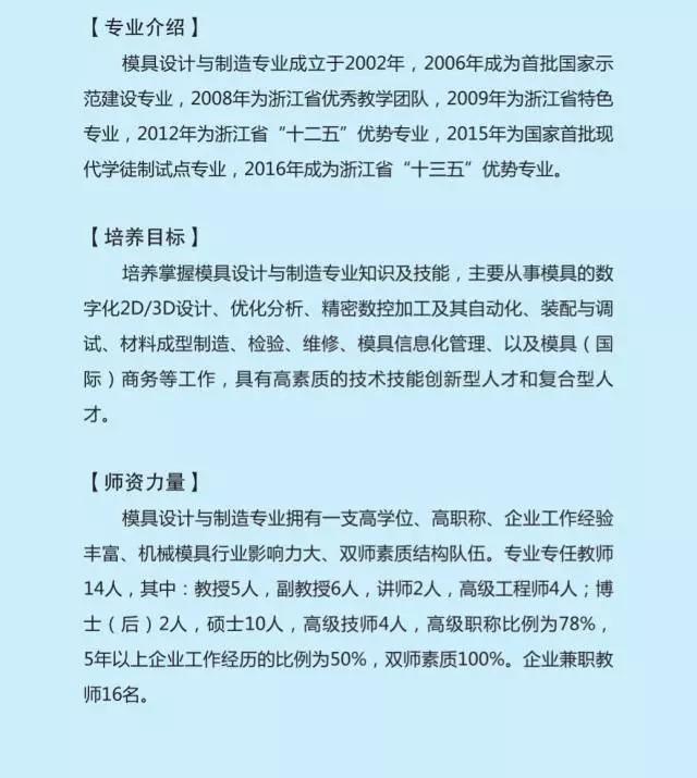 模具设计与制造专业2017年招生160人,其中提前招生45人。(招生数据按2017年度学校发布招生计划为准)