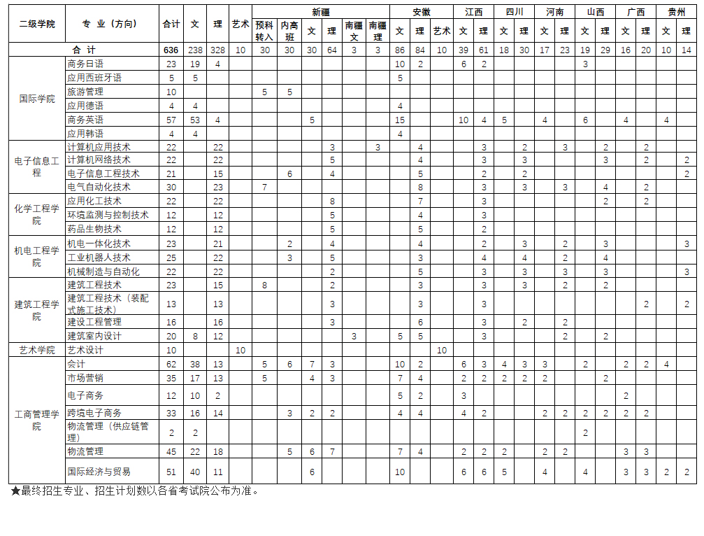 宁波职业技术学院2020年普通高考省外招生计划
