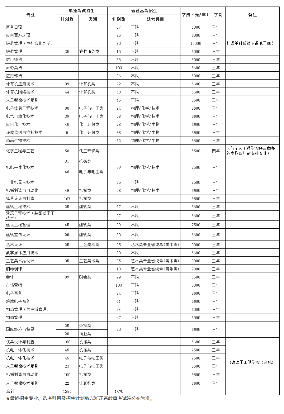 宁波职业技术学院2020年浙江省招生计划