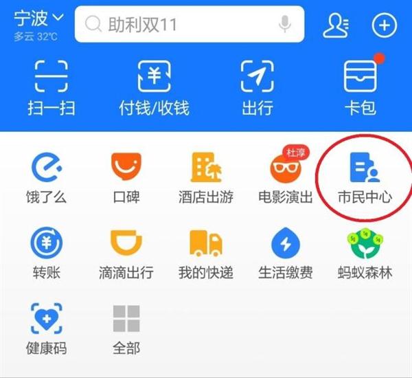 1.1打开支付宝,选择首页的“市民中心”: