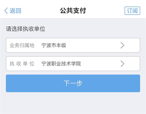 2.6选择业务归属地“宁波市本级”,和执收单位“宁波职业技术学院”,然后点击下一步进行缴款: