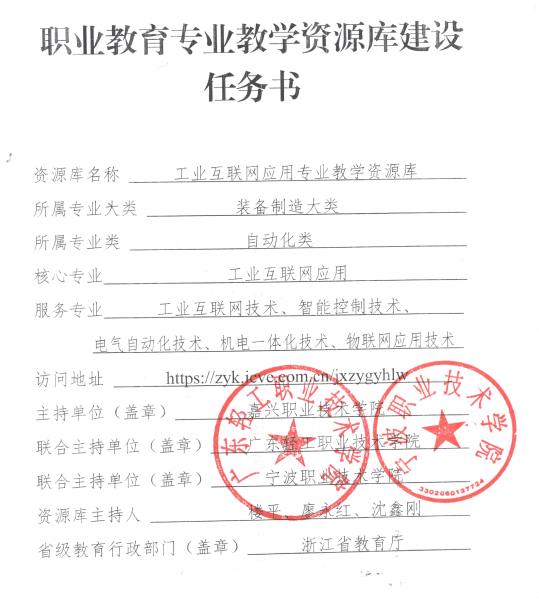 我校工业互联网应用专业现为国家工业互联网行业产教融合共同体常务副理事长单位(如图1),国家工业互联网应用专业教学资源库主持单位(如图2),建成省内首家集教学、竞赛、科研一体的工业互联网集成应用实训中心。